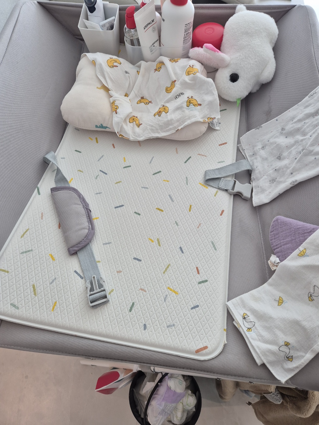 위생 측면에서도 장점이 명확합니다. 바닥에서 기저귀를 갈 때는 먼지와 이물질 접촉이 불가피하지만, 독립된 갈이대 공간은 훨씬 청결합니다. 특히 방수 패드가 장착된 제품은 배변 사고 시에도 간단히 닦아내면 되어 관리가 용이합니다. 신생아 시기에는 목욕 후 드레싱 테이블로도 활용 가능해 다용도로 쓸 수 있습니다.