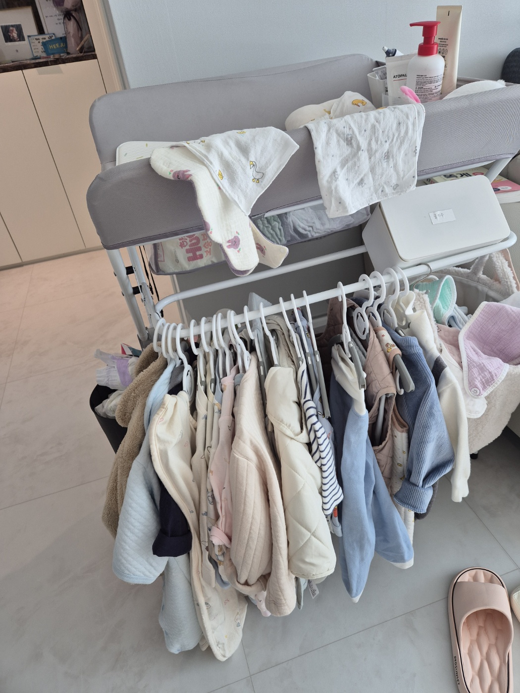 또한 갈이대의 수납 기능은 육아 동선을 혁신적으로 단축시킵니다. 기저귀, 물티슈, 발진 크림, 여벌 옷 등 필요한 모든 물품이 손만 뻗으면 닿는 곳에 배치되어 있어, 아기를 두고 거실로 뛰어가는 위험한 상황을 원천 차단합니다. 하단과 측면의 넉넉한 수납공간은 육아 효율성을 극대화하는 핵심 요소입니다.